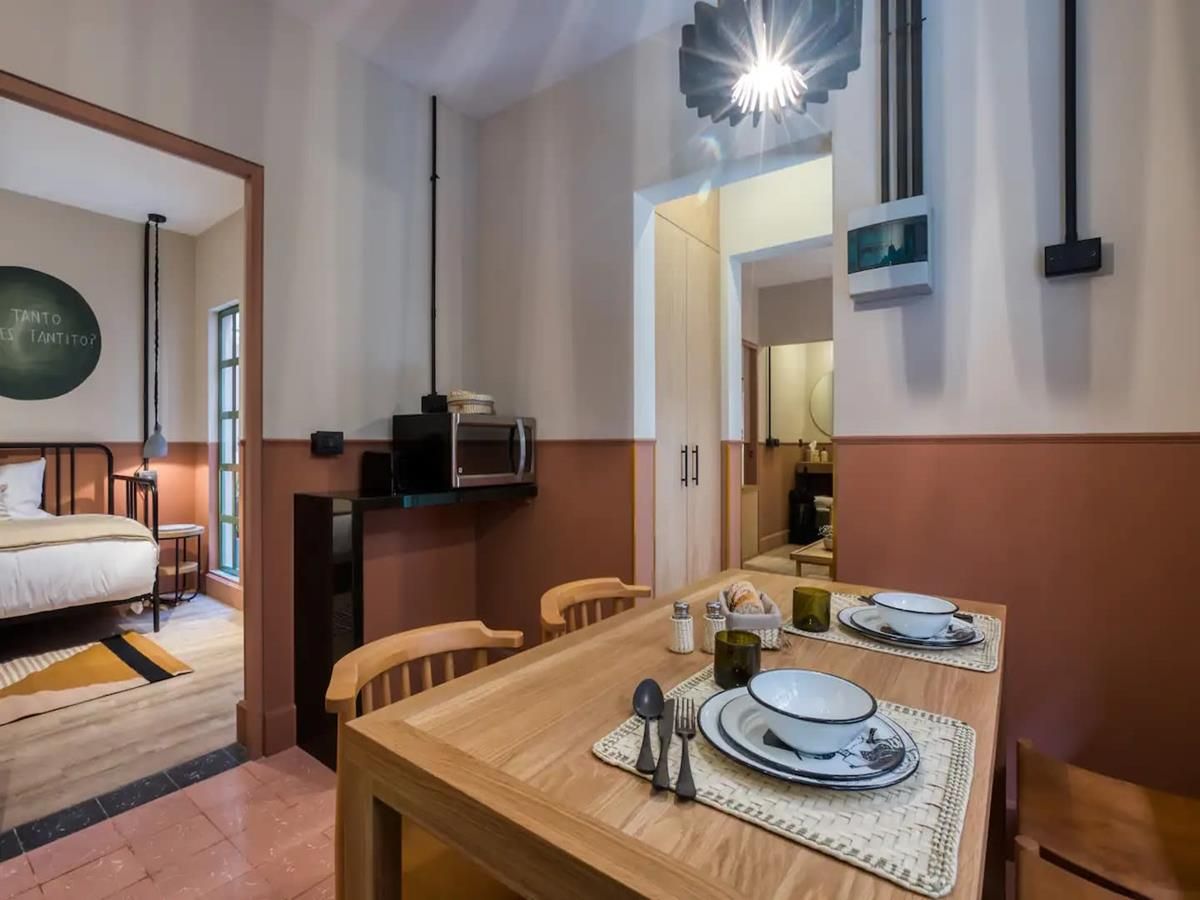 As you enter, you’ll be met by the living room which has a sofa, a flat-screen TV and eclectic asthetics. Continuing is located the dining table for 4 guests. There is a fully equipped kitchen with first brand appliances and dinnerware. The master bedroom has a king-size bed and a lovely small patio to enjoy your morning coffee. The ensuite bathroom has a walk-in shower. The second bedroom has a queen size bed and can and shares a full bathroom with the rest of the apartment.